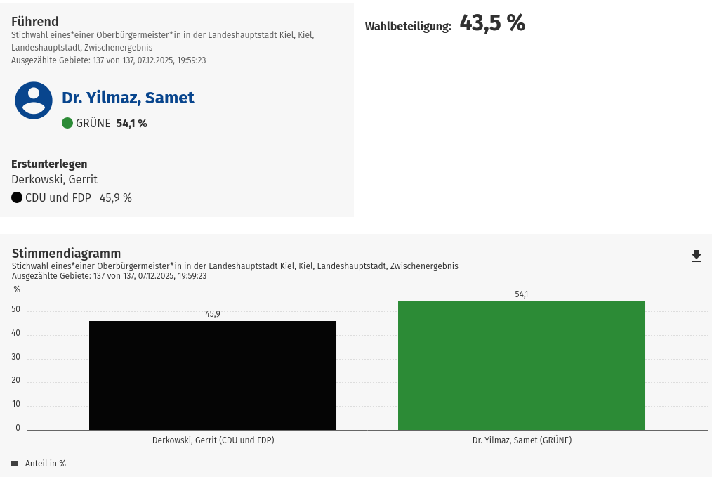 Nach Auszählung aller Wahlkreise liegt Yilmaz mit 54,1 Prozent vorne, Derkowski konnte lediglich 45,9 Prozent auf sich vereinen. Damit liegt Yilmaz mit 8,2 Prozent vorne und damit ist der Vorsprung mehr als doppelt so hoch wie im ersten Wahlgang. Und das obwohl neben den GRÜNEN lediglich Volt bei der Stichwahl für Yilmaz engagiert waren.