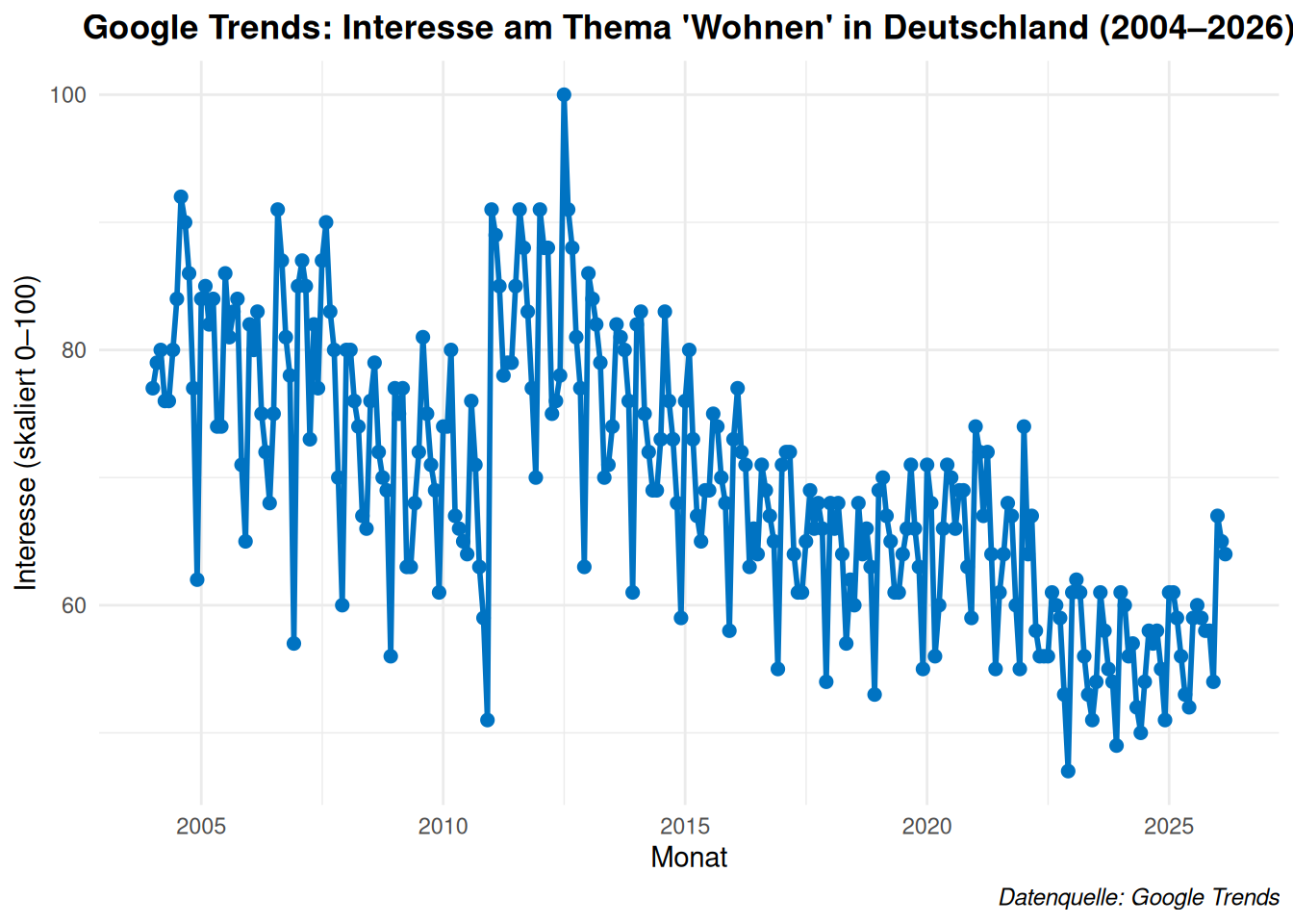 Das Interesse am Thema war um 2012 am Höchsten. Heute hat sich das Interesse an dem Thema fast halbiert. Zwar nahm der Zubau an Wohnungen seit 2012 zu, konnte aber mit der gestiegenen Nachfrage nicht mithalten. Seit 2024 nimmt der Bau wieder angesichts gestiegener Baukosten und Zinsen ab.